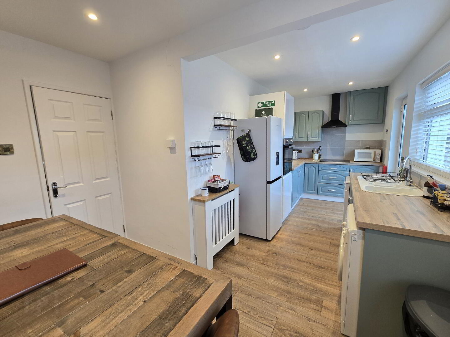 With wood effect laminate flooring, range of eye and low level units, laminate work top, white 1.5 sink, integrated oven, ceramic hob, hooded extractor fan, space for Fridge Freezer, washing machine and dishwasher.