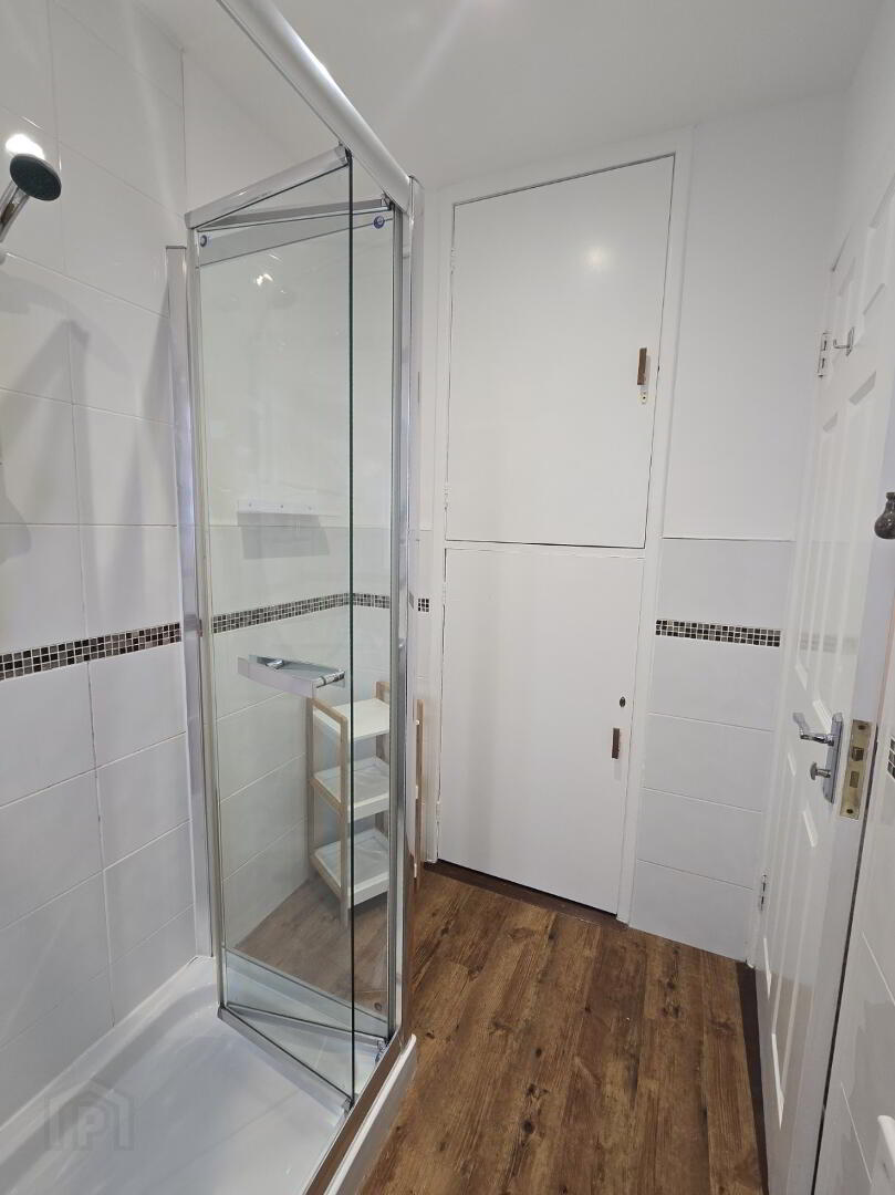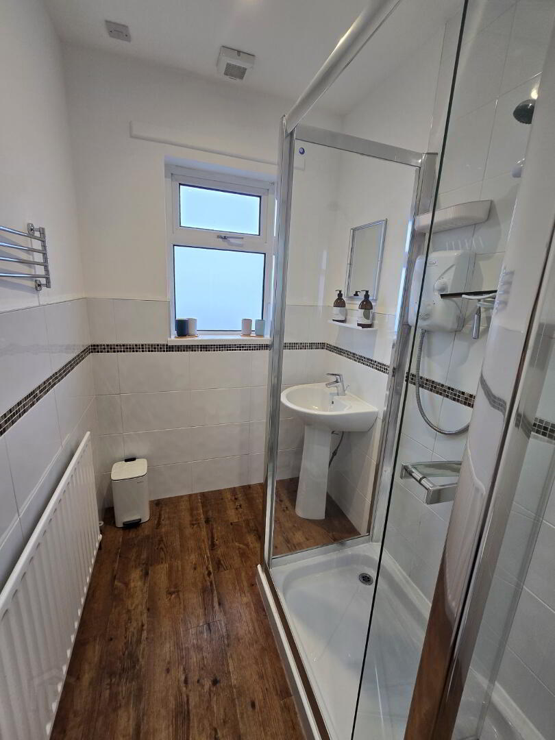 SHOWER ROOM: With Wood effect vinyl flooring, white tiled walls and shower cubical with Electric shower.