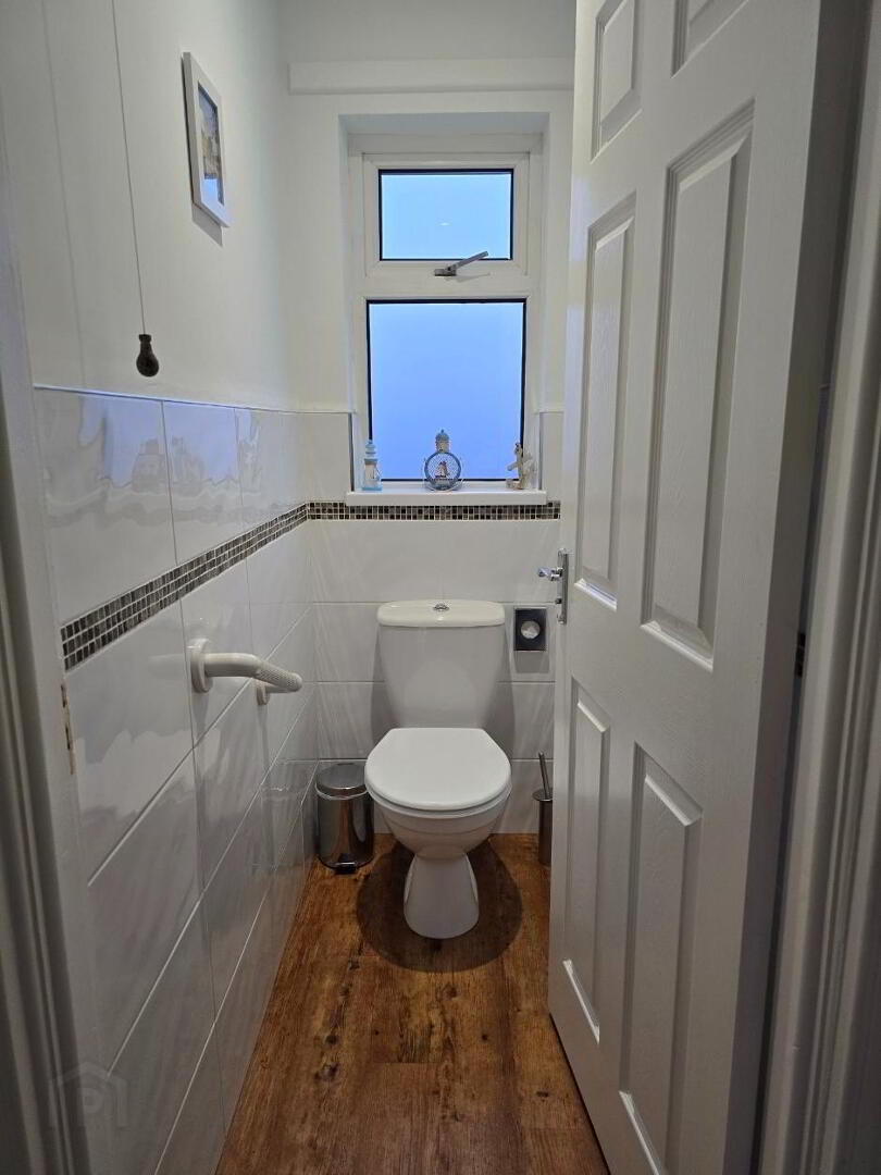 Wood effect vinyl flooring, half white tiled walls, white WC.