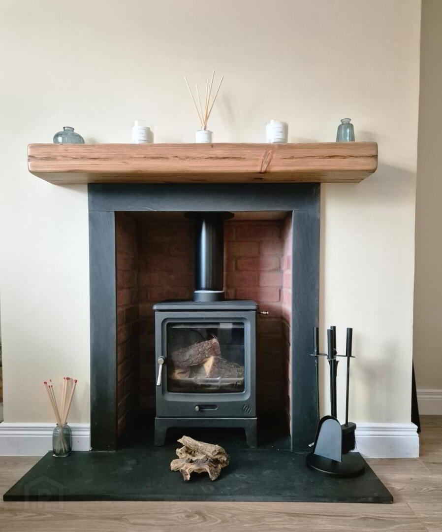 With wood effect laminate flooring, feature multifuel stove, oak beam, and TV point.