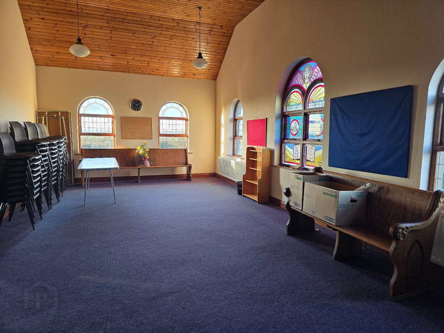 The property comprises one expansive structure incorporating the main church, an entrance hall, and an additional church hall – all seamlessly connected. Character and charm flow throughout, with beautiful original stained-glass windows providing a striking focal point and an irreplaceable sense of history.