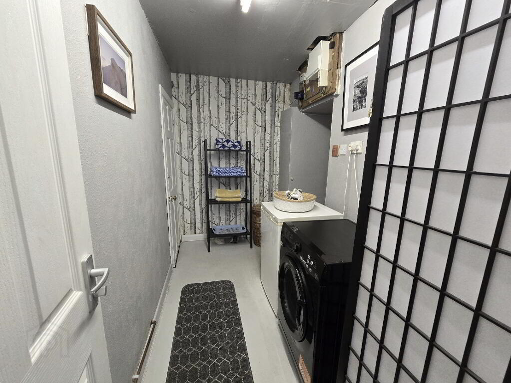 With concrete flooring, plumbed for washing machine, space for freezer and boiler.