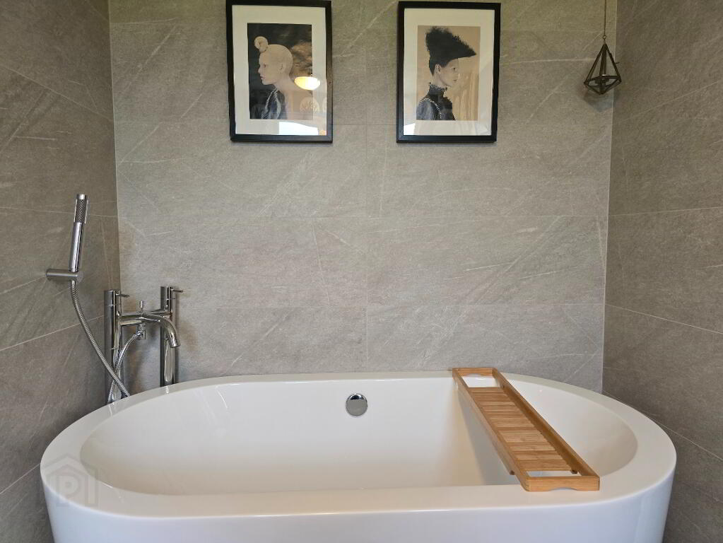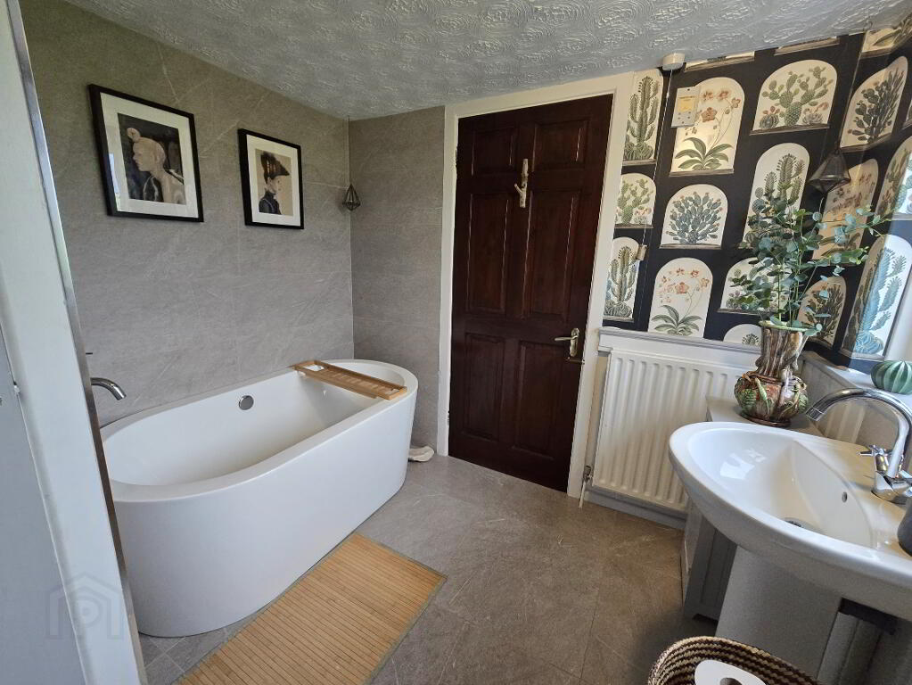 With tiled flooring, and partially tiled walls, white modern suite comprising low flush toilet, wash hand basin and freestanding double ended bath, floor Mounted Freestanding Bath Shower Mixer, wooden panelling around remainder of bathroom and access to Hot-press with shelving.