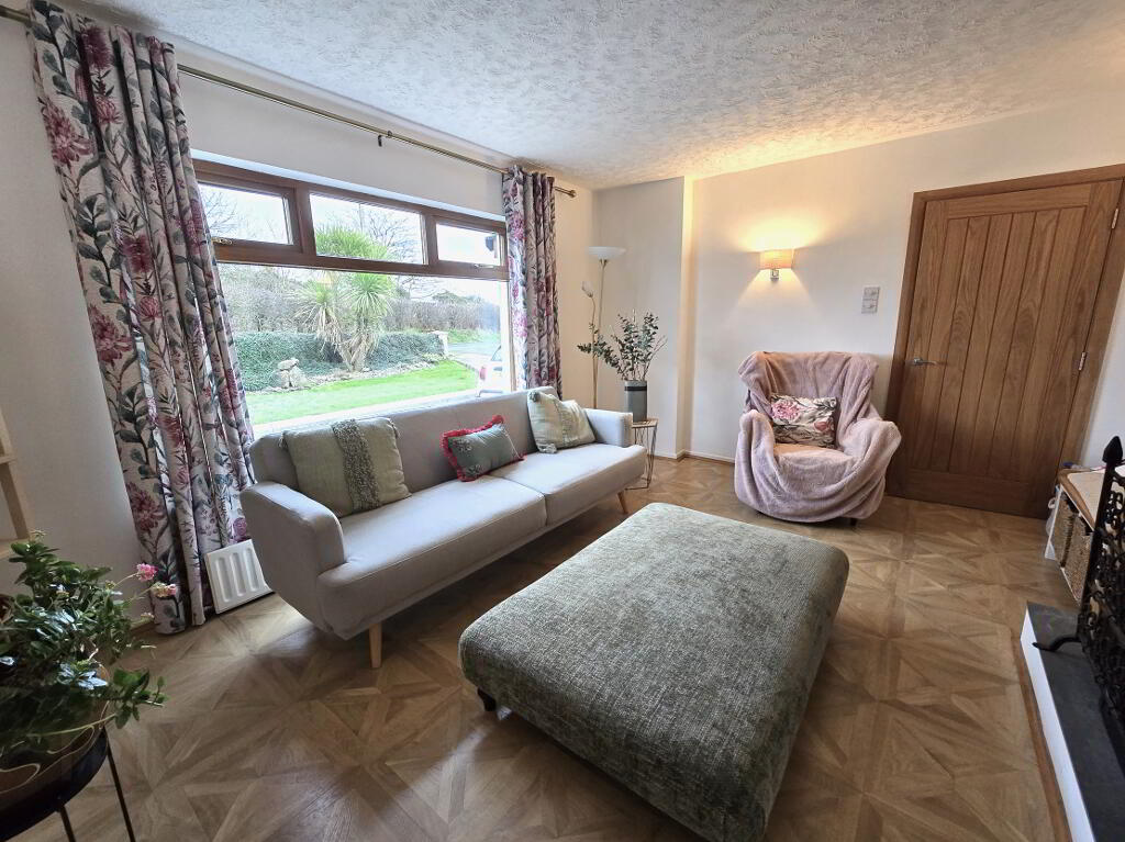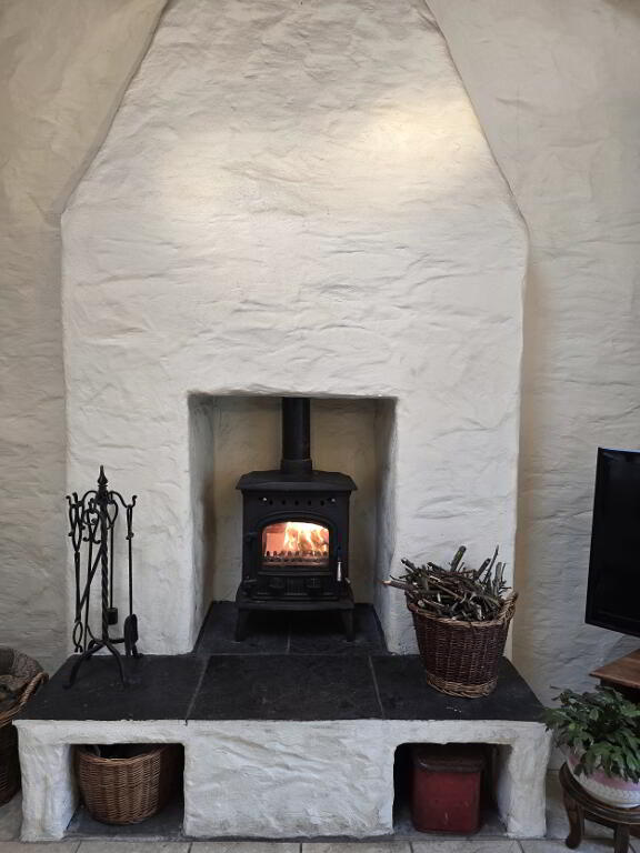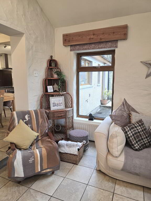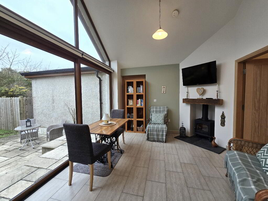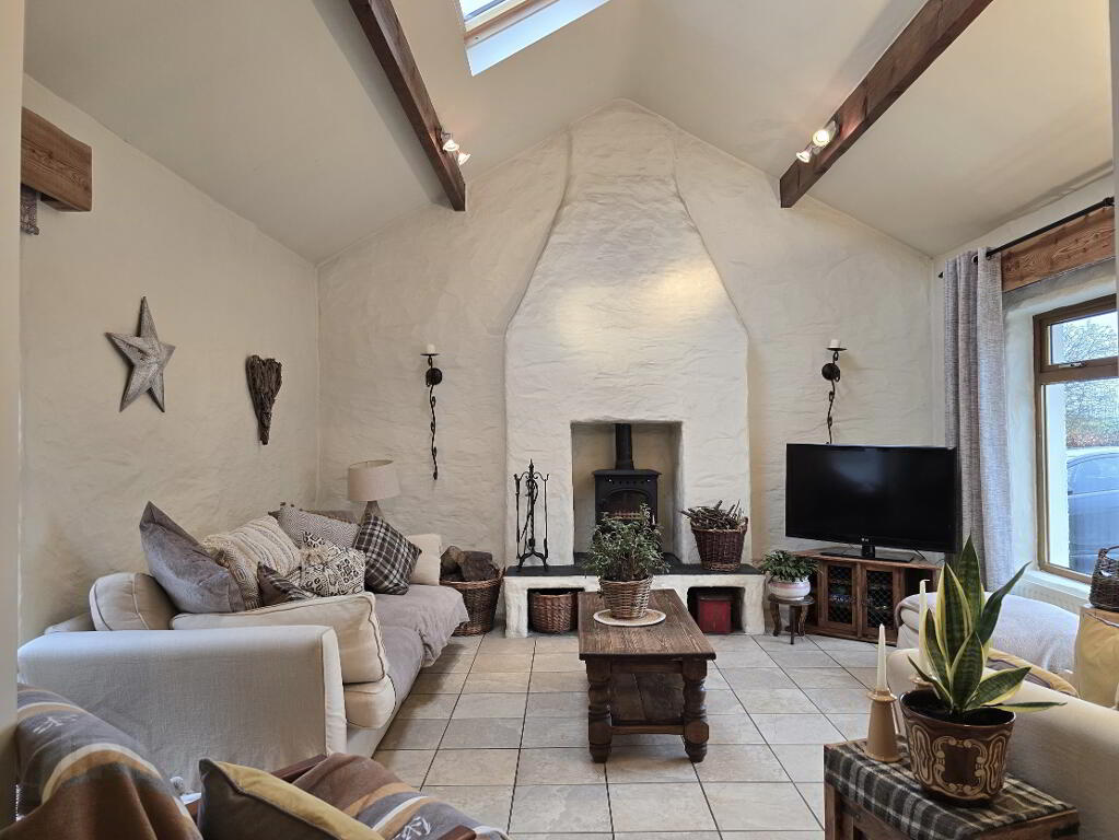 With tiled flooring, dual aspect windows, inglenook feature fireplace with multifuel stove and TV point.