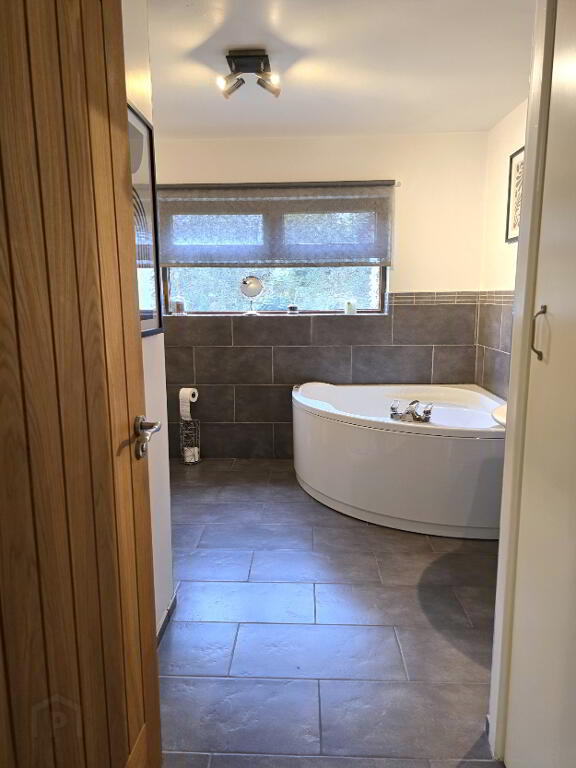 With white suite comprising of a corner bath, low flush w.c., vanity wash hand basin, fully tiled shower cubicle with thermostatic shower fitting and tiled floor.