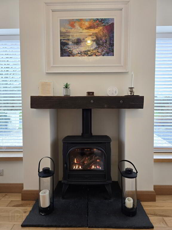 With Oak flooring, vaulted ceiling, Gas stove, slate hearth and feature beam and TV point.
