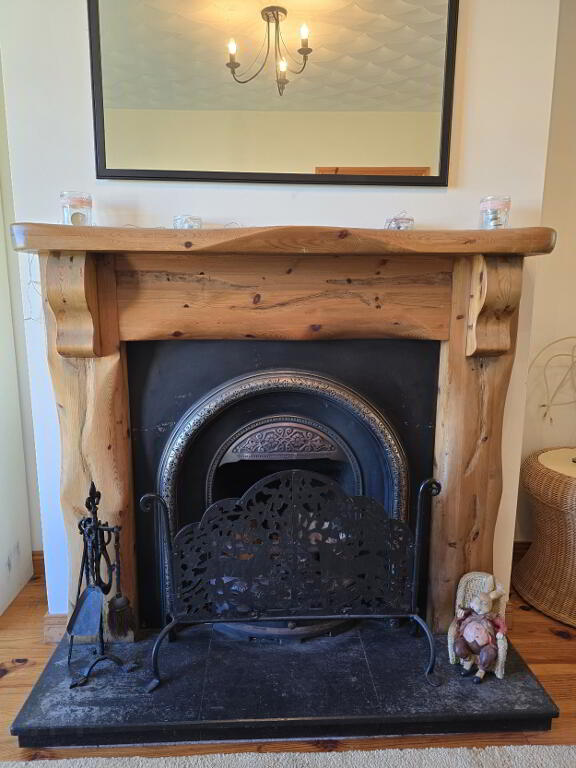 With wooden flooring, pine fire surround with ornate fire with metal inset and slate tiled hearth and TV point.