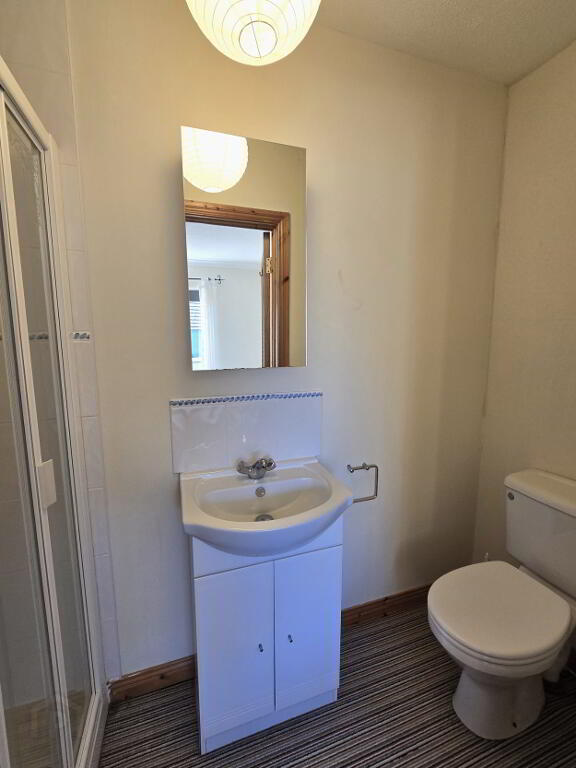 With carpet flooring, white low flush toilet, white wash hand basin with vanity unit below, fully tiled shower enclosure with electric shower and extractor fan.