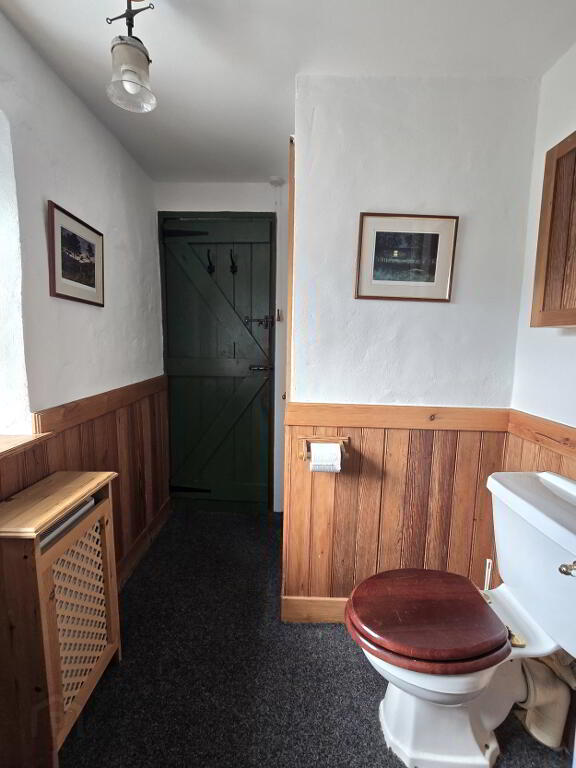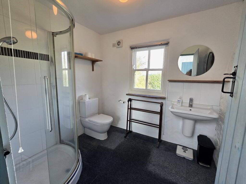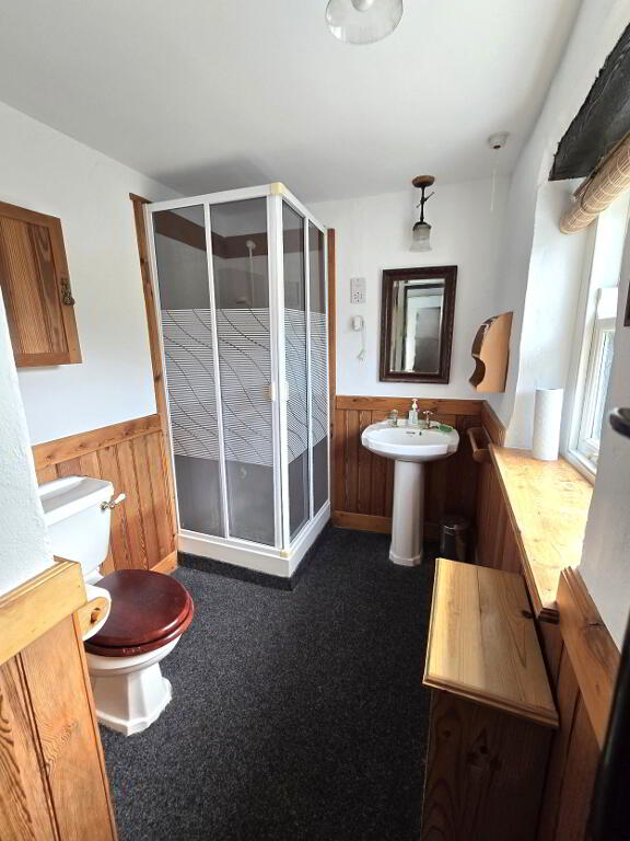 With Carpet flooring, 1/2 wooden panelled walls, white WC, white wash hand basin, shower enclosure with electric shower and hot press.