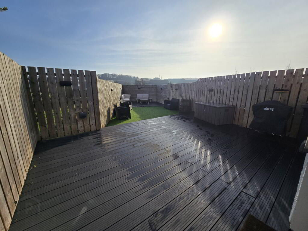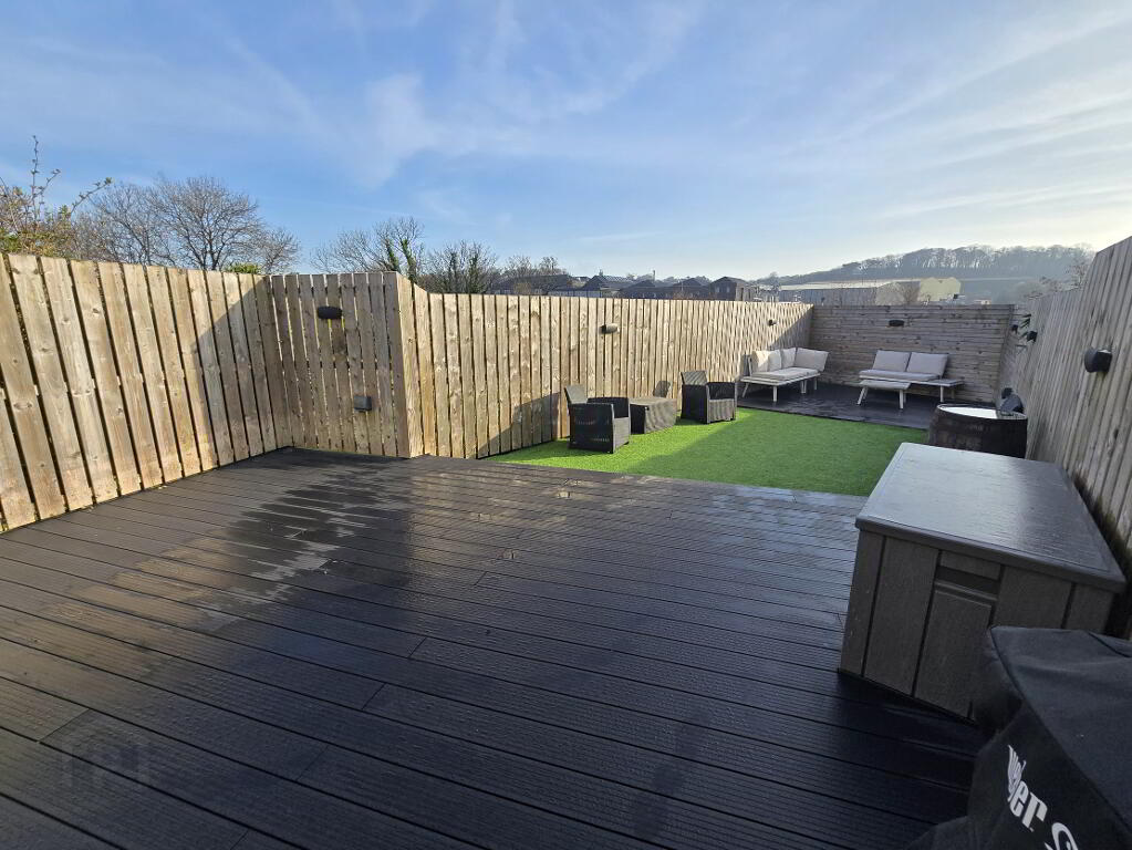 Fully enclosed rear garden with composite decking, electric points, lights and tap.