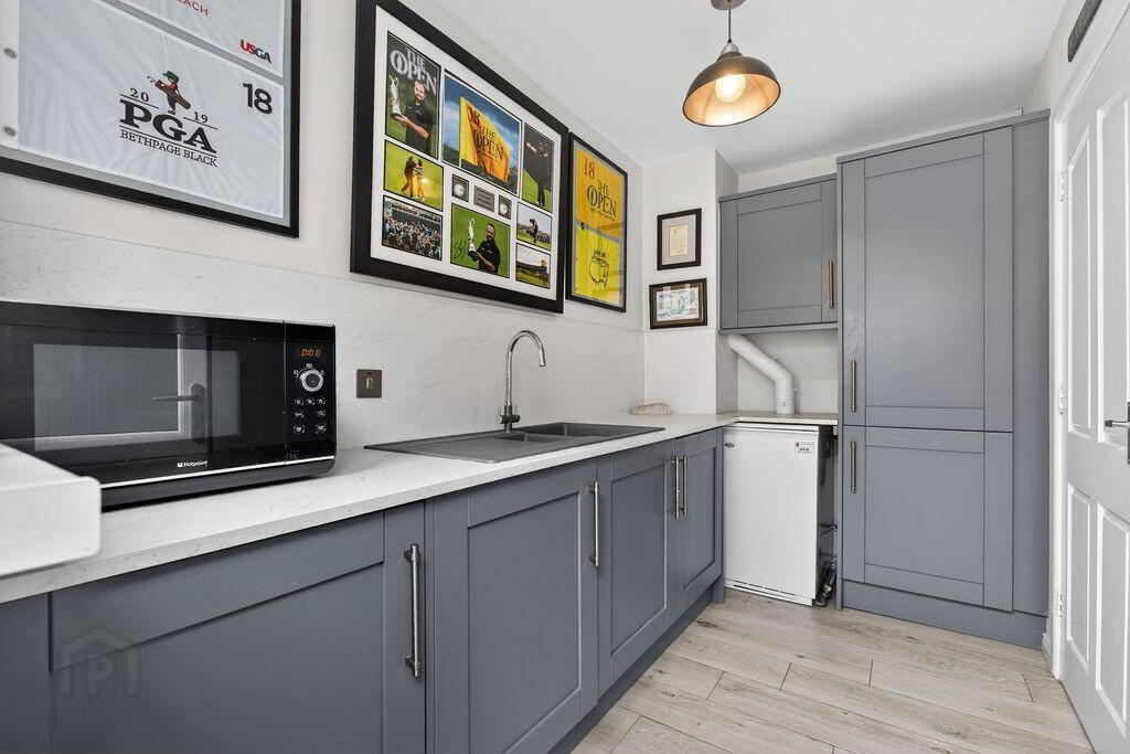 With tiled flooring, range of eye & low-level units, work surfaces with matching splashback, 1.5 bowl single drainer sink unit with mixer tap, 4 ring hob with extractor fan over and electric oven under, integrated fridge, wine cooler, concealed strip lighting, sliding doors to rear patio.