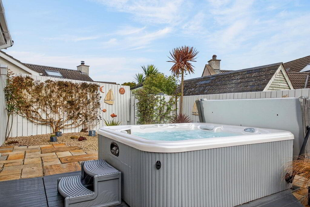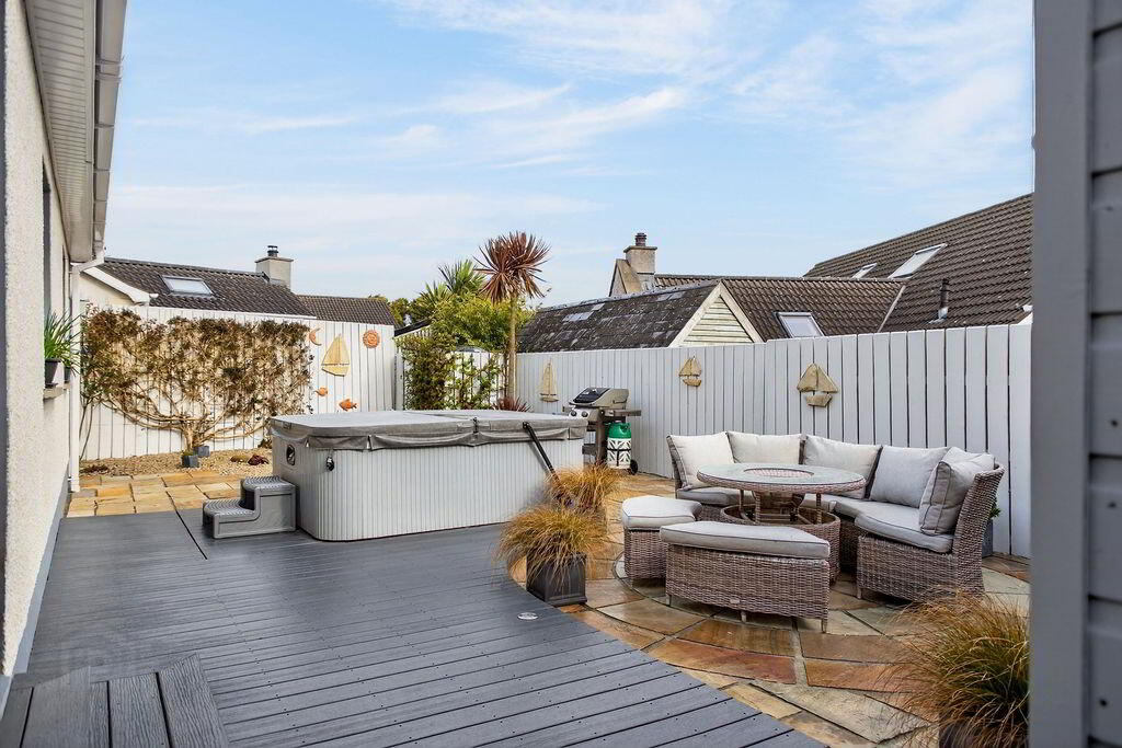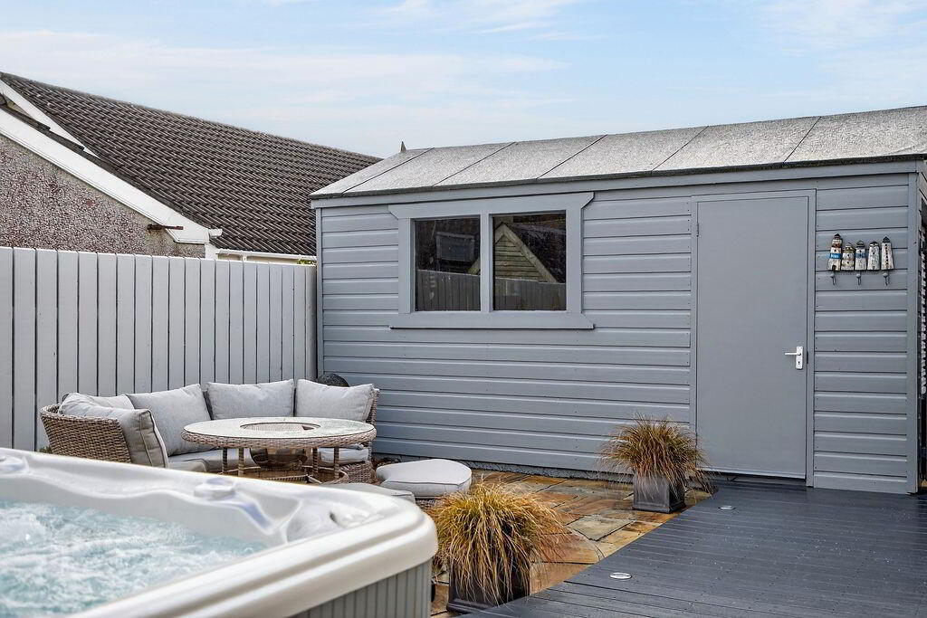 The front garden is attractively landscaped with loose stones, complemented by a spacious driveway providing parking for multiple vehicles and electric car charging point. To the rear, a private and low-maintenance enclosed garden features a circular paved seating area, composite decking, and a six-person hot tub. The space is fully equipped with electricity, enclosed by boundary fencing, and enhanced by a selection of established plants.