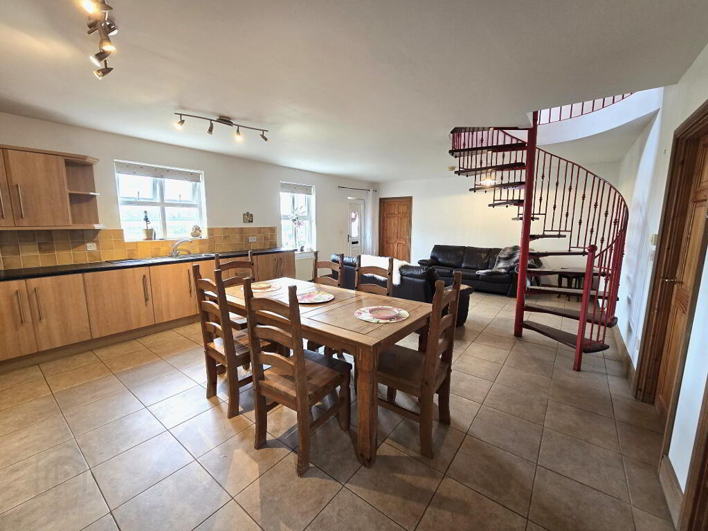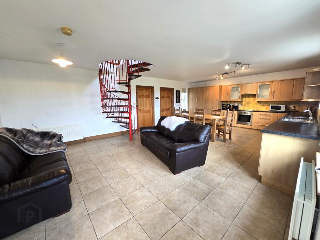 With tiled flooring, eye and low level kitchen units, built-in hob, oven and extractor fan, 1 1/2 stainless steel sink and access to 1st floor via spiral staircase.