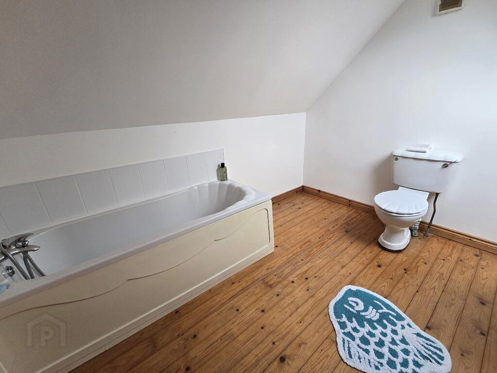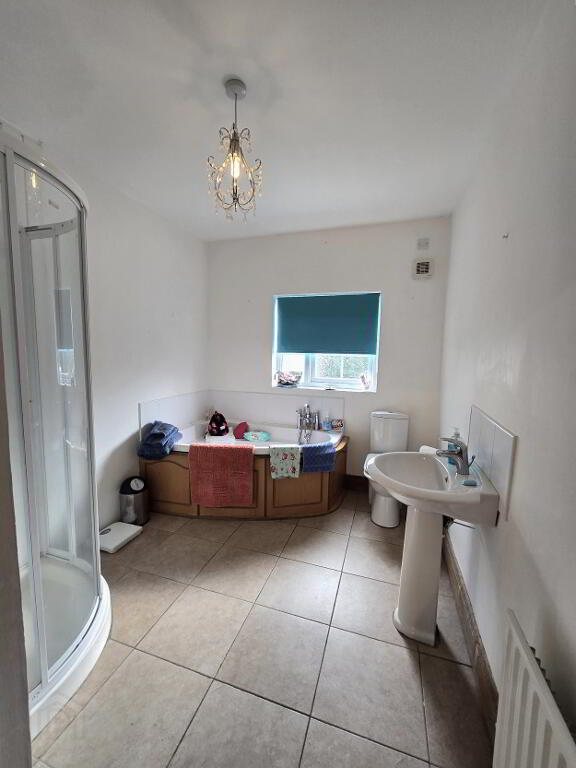 With tiled flooring, white bathroom suite including corner bath, corner enclosed shower and access to hot-press.