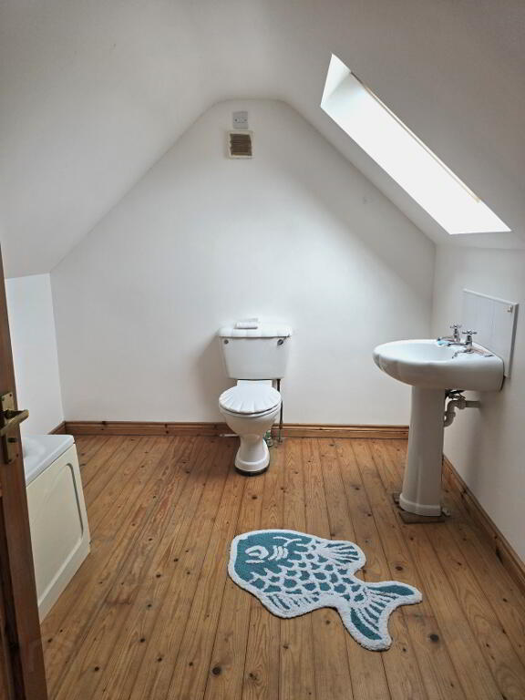 With wooden flooring, white bathroom suite including bath, WC, Wash hand basin and velux window.